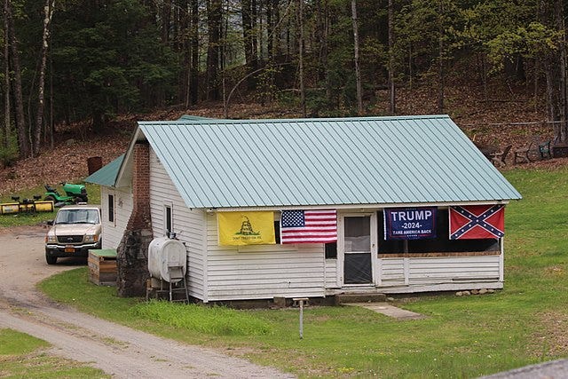 A Gadsen flag, American flag, Trump flag, and Confederate flag in the Warren County Adirondack town of Horicon, New York, dated May 12, 2021. Tyler A. McNeil.