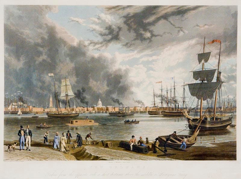 View looking from Algiers (probably about where Mardi Gras World is now) looking across the Mississippi River. On river are a variety of sailing ships, steam ships, row-boats, and a flatboat. Across the …
