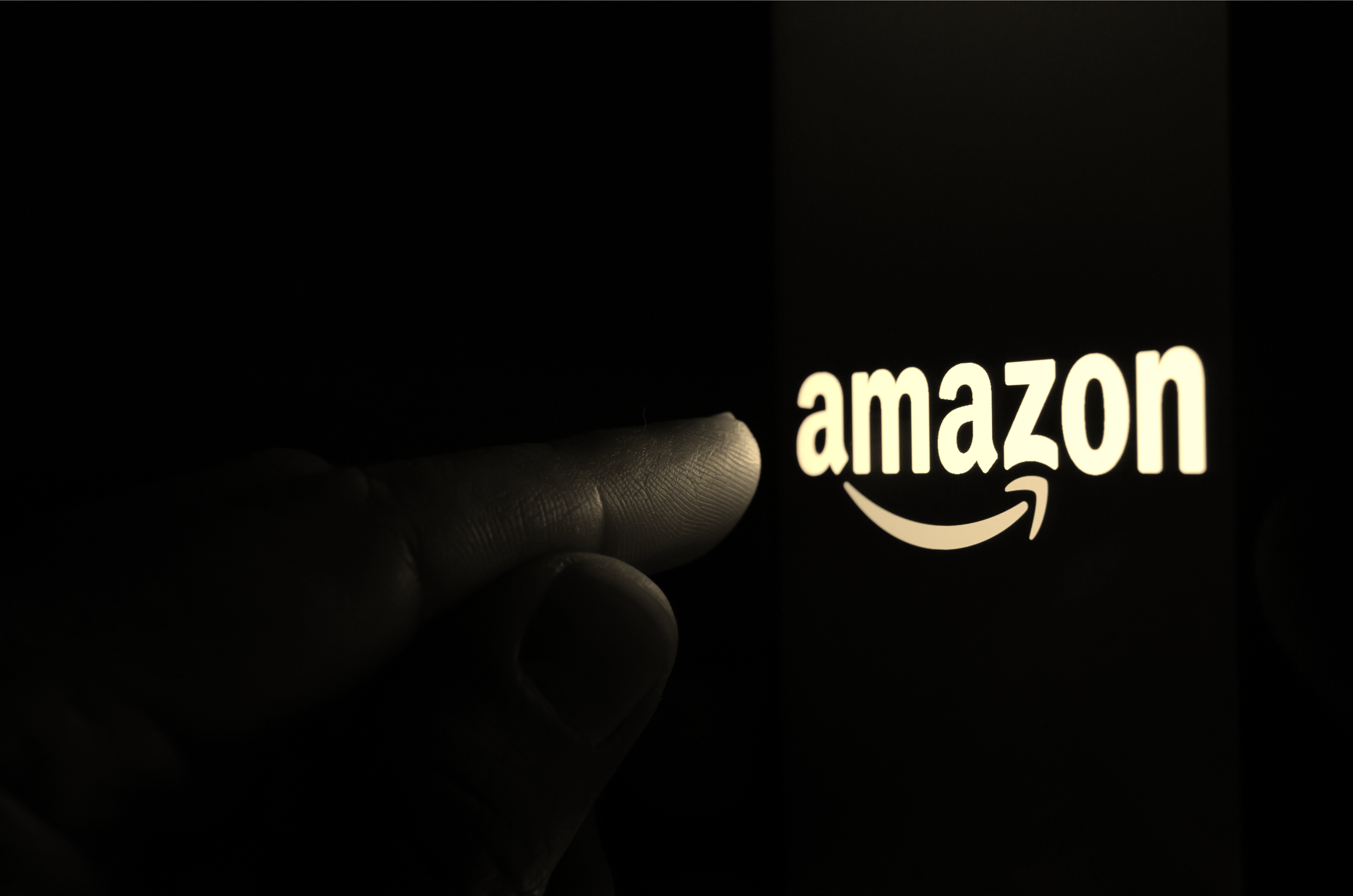Amazon logo on a screen in a dark and finger pointing at it. Concept. Stafford, United Kingdom - November 119. Courtesy of Shutterstock.