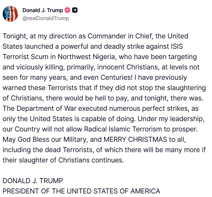 Last night, President Trump announced in his signature fashion that the U.S. had conducted airstrikes against ISIS targets in northwestern Nigeria. He fused patriotism, religious liberty, and civilizational rhetoric, framing the strikes as a defense of persecuted Christians. Nigeria’s Foreign Minister confirmed that the strikes were carried out in coordination with the U.S., under a preexisting intelligence-sharing and security cooperation framework.