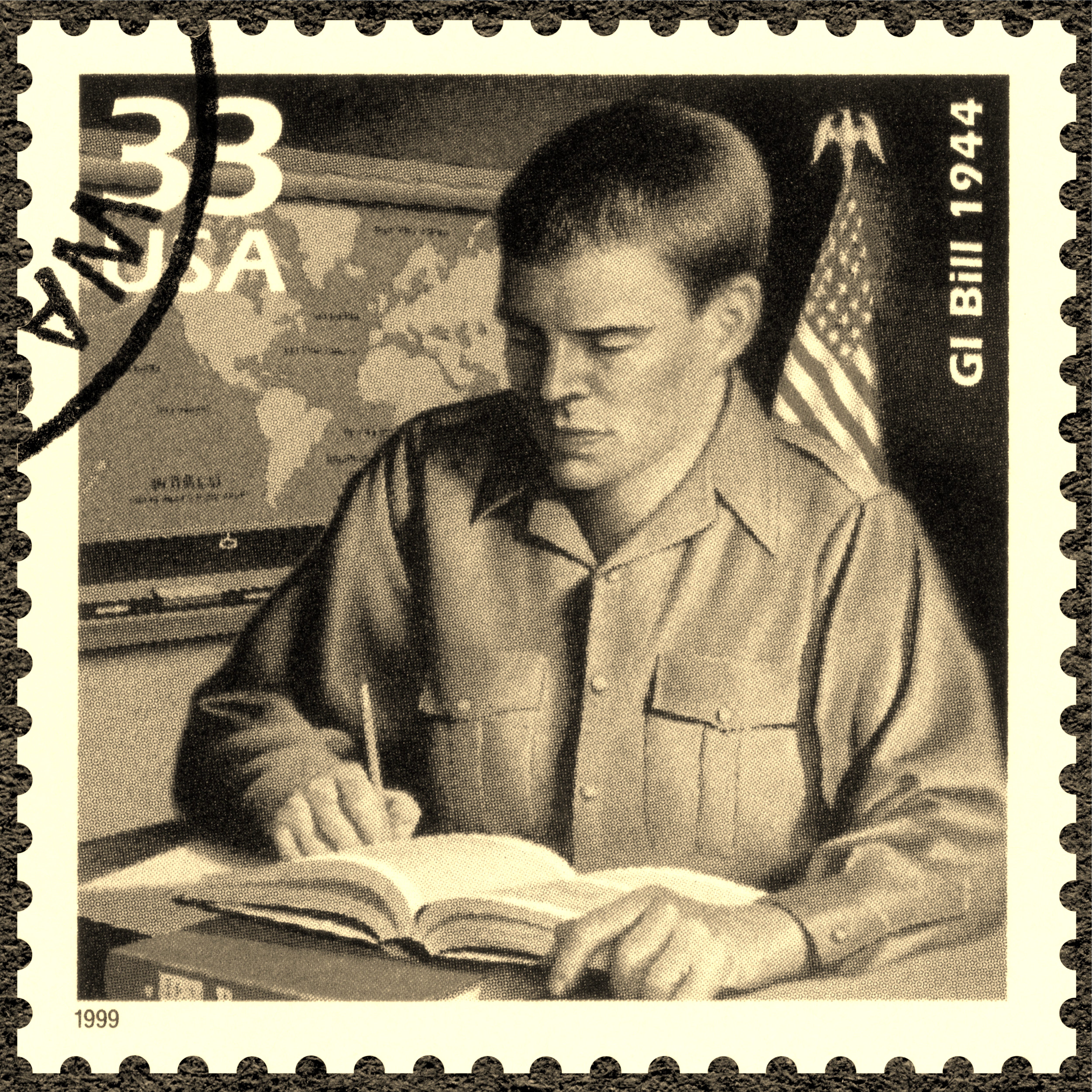 MOSCOW, RUSSIA - JANUARY 26, 2021: A stamp printed in USA shows GI Bill, The Servicemen Readjustment Act, 1944, series Celebrate the Century, 1940s, 1999. Courtesy of Shutterstock.