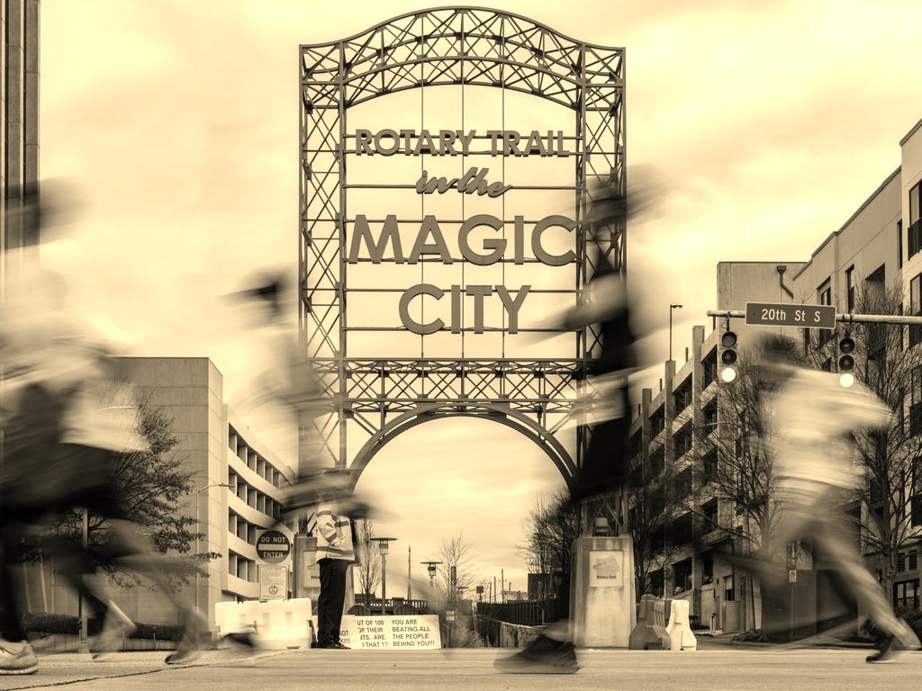 Birmingham, United States: February 16, 2020: Magic City Sign with Blurred Runners. Courtesy of Shutterstock.