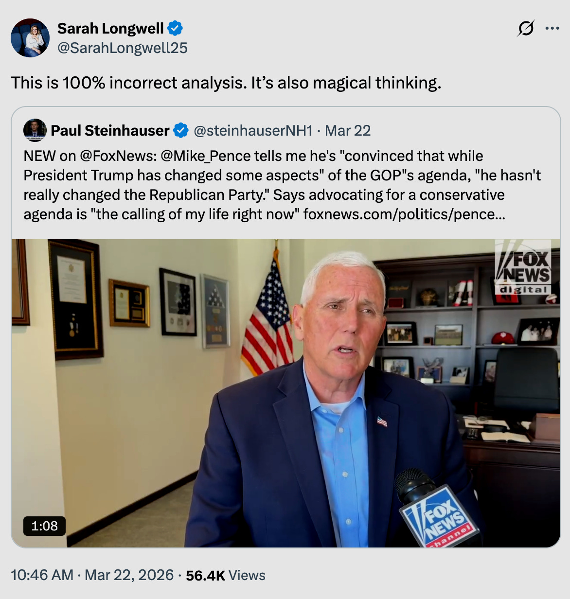 In this episode of Reality Checking the Bulwark, Steward Beckham and I examine tweets from Sarah Longwell and Tim Miller. First, Longwell reacts to a Mike Pence clip, arguing that Trump is a break from the Republican Party – no matter how much the GOP’s former Vice President and political history suggest otherwise.