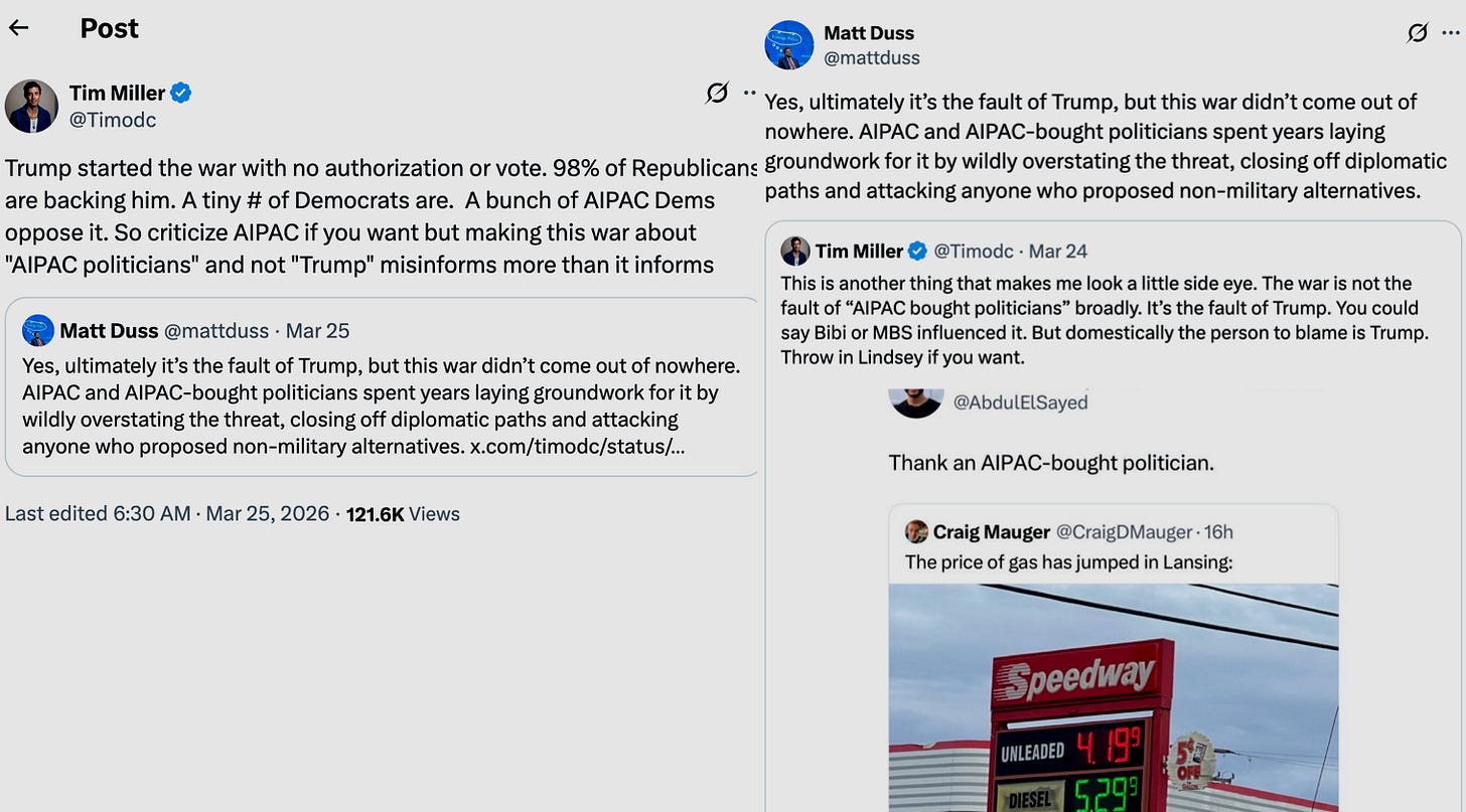 Then Miller responds to Michigan Senate Democratic primary candidate Abdul El-Sayed’s tweet blaming AIPAC-aligned politicians for escalating gas prices in Michigan. Miller cries “misinformation,” but we wonder whether his own message is the actual misinformation.
