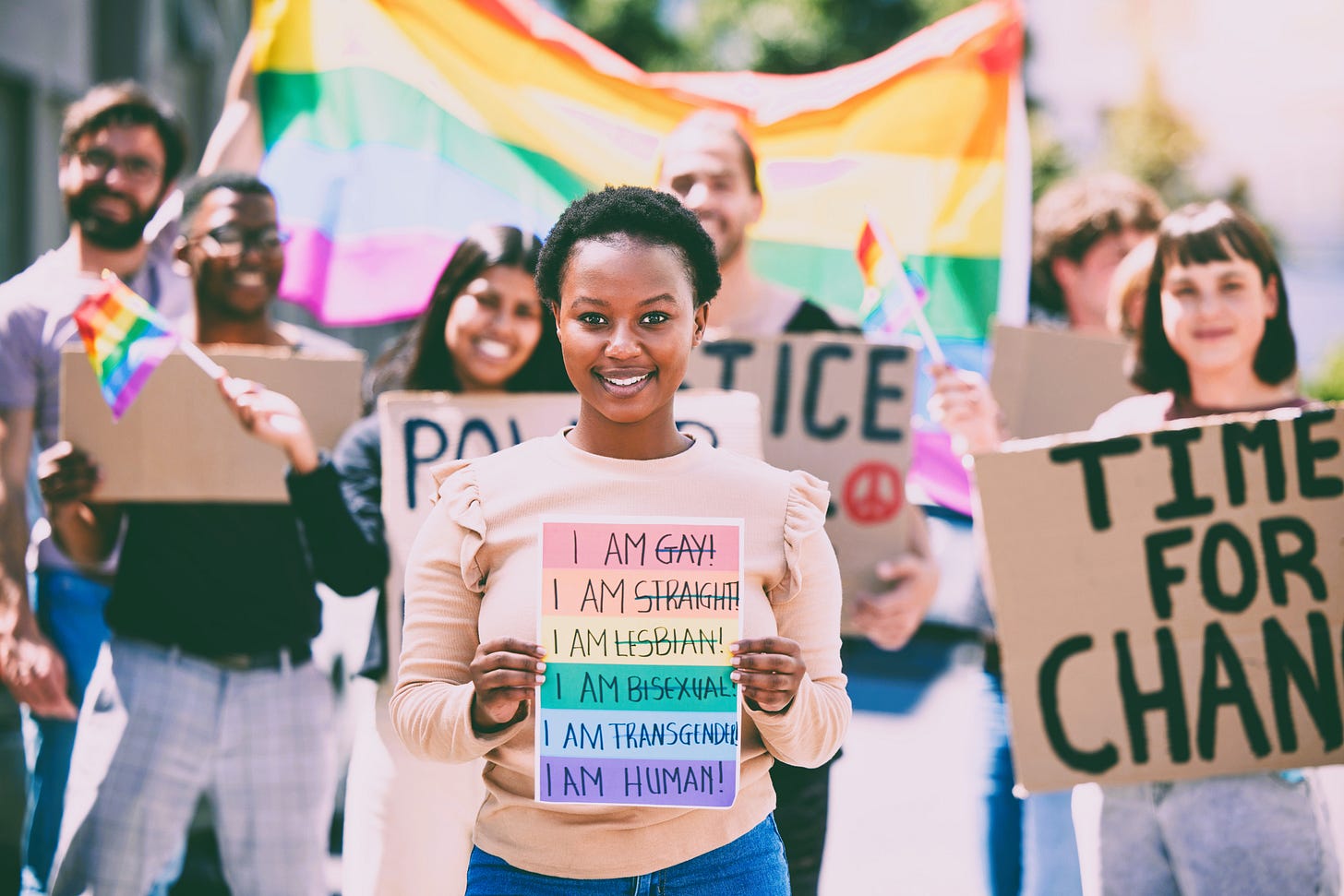 We are all human. Shot of a group of young people protesting for LGBTQI+ rights. Shutterstock.