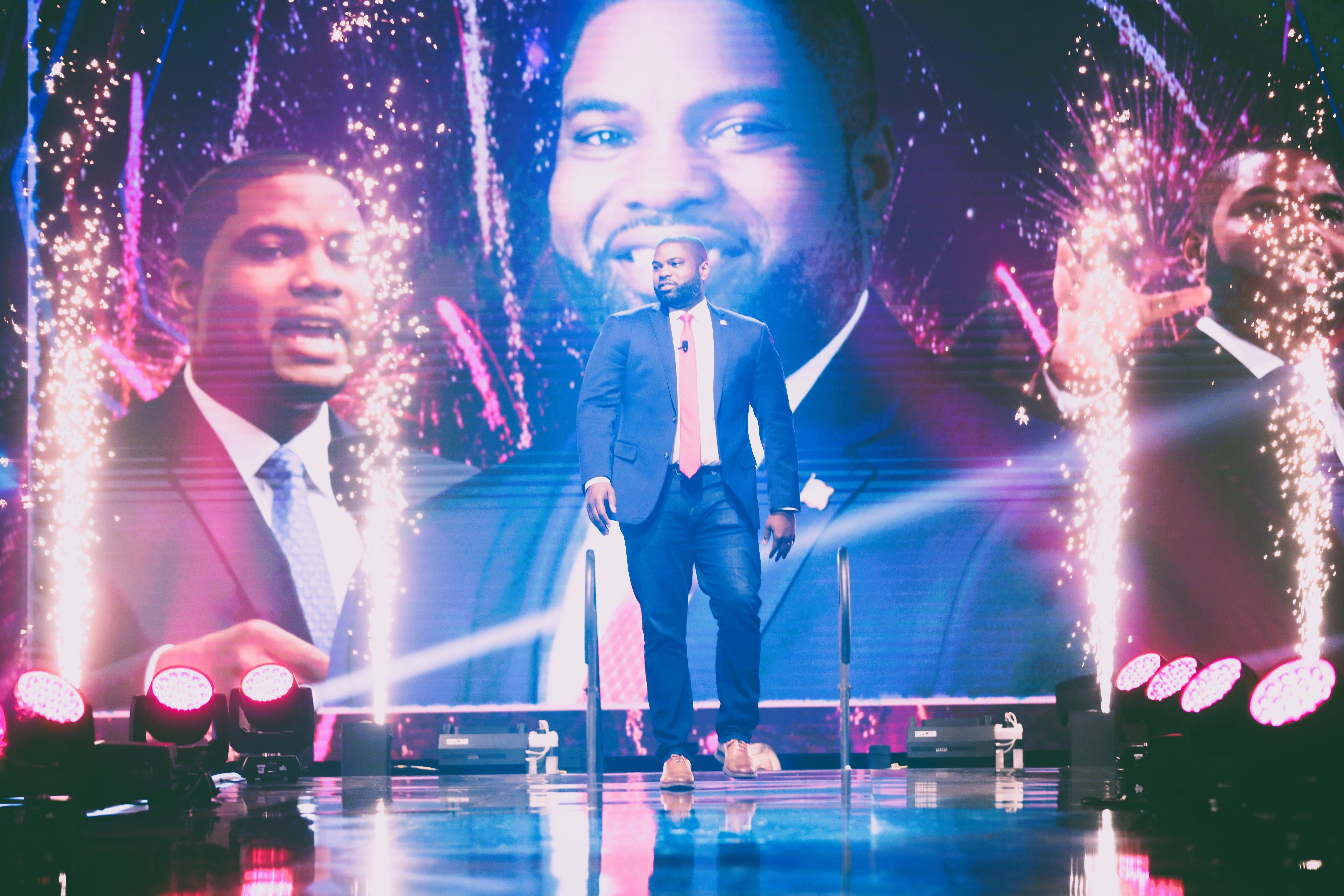 U.S. Congressman Byron Donalds speaking with attendees at the 2022 AmericaFest at the Phoenix Convention Center in Phoenix, Arizona. Wikimedia Commons.